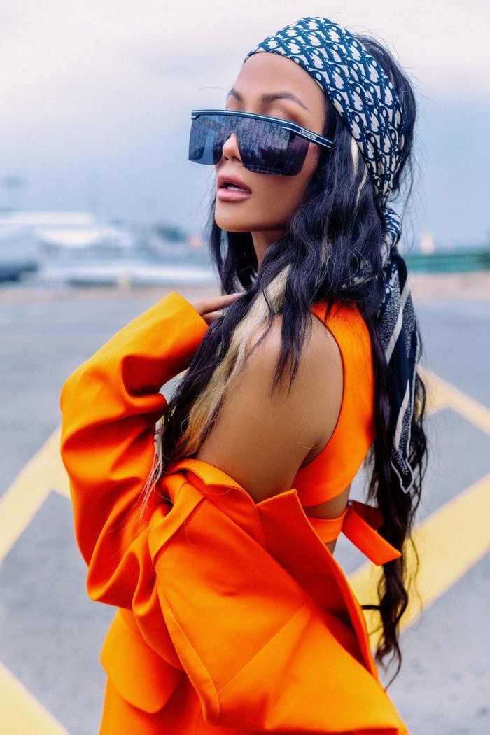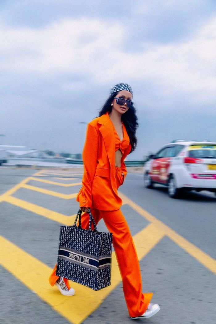 Cô diện set đồ màu cam nổi bần bật kèm với những món phụ kiện thời trang đắt giá.