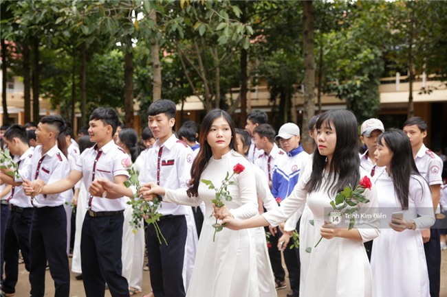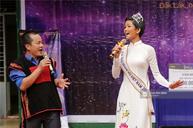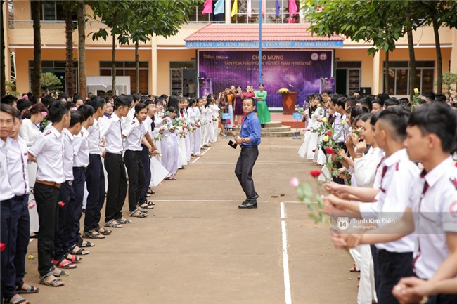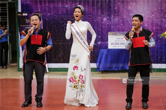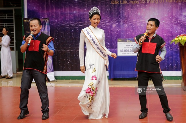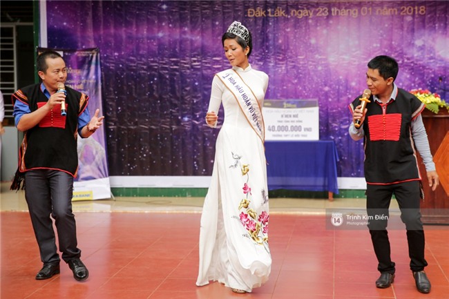Các thầy cô liên tục có những tiết mục văn nghệ "cây nhà lá vườn" để chào mừng cựu học trò về thăm trường cũ. H'Hen Niê bất ngờ xuất hiện trên sân khấu, nhún nhảy theo tiết mục của các thầy cô.