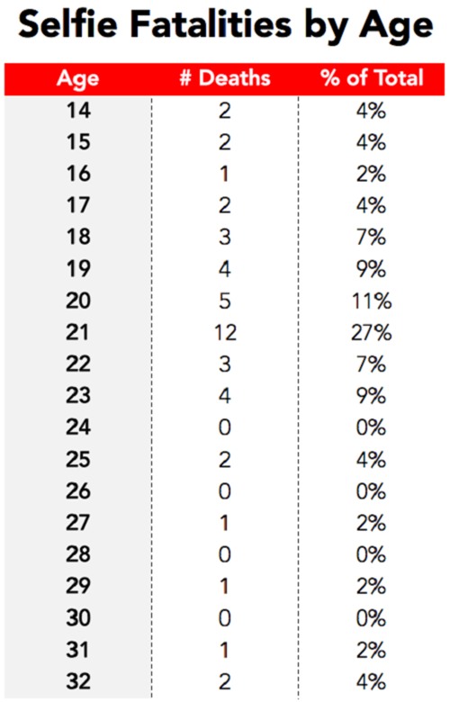 Tuy nhiên, chụp ảnh tự sướng là một chuyện. Nhưng chết vì chụp ảnh tự sướng lại là chuyện khác. Theo thống kê, riêng năm 2014, có 49 người trên thế giới chết vì selfie, trong đó, hơn 73% là nam giới, ở độ tuổi 21.