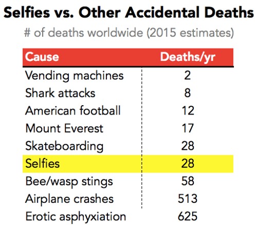 Đó là lý do vì sao, theo các nhà nghiên cứu, tỉ lệ người chết vì chụp ảnh tự sướng còn nhiều hơn số người bị cá mập tấn công chết người năm 2015.