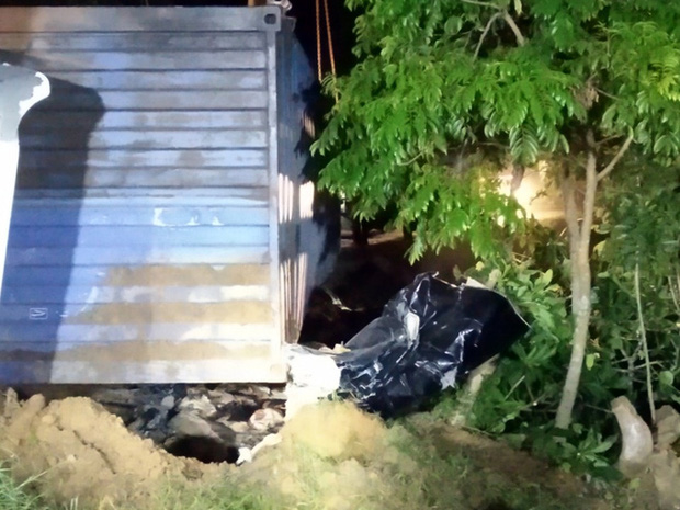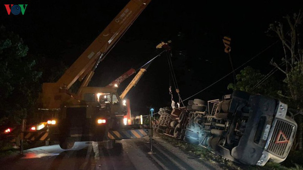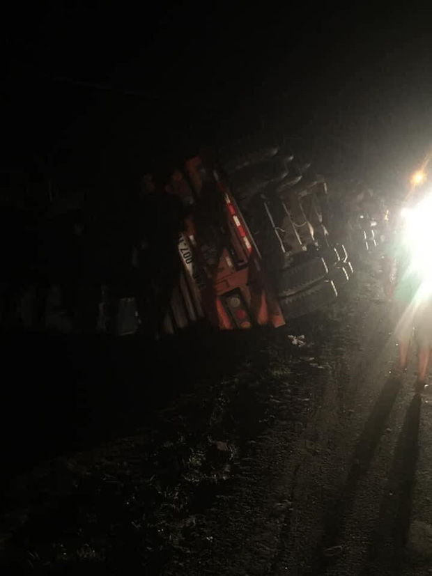 Thùng xe container lật nghiêng trên đường - Ảnh: báo Quảng Ninh