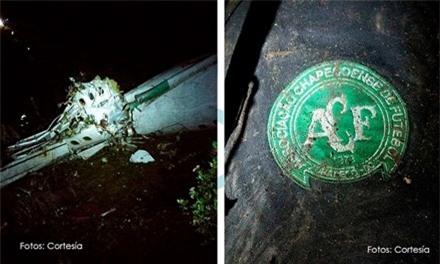Được biết máy bay đang trong hành trình chở đội bóng Chapecoense cùng ê kíp từ Brazil đến sân bay quốc tế Jose Maria Cordova de Rionegro (Medellin) để tham gia trận đá lượt đi chung kết Copa Sudamerica vào ngày 30/11. (Trong hình là đồng phục gắn logo đội bóng được tìm thấy trong đống đổ nát) |