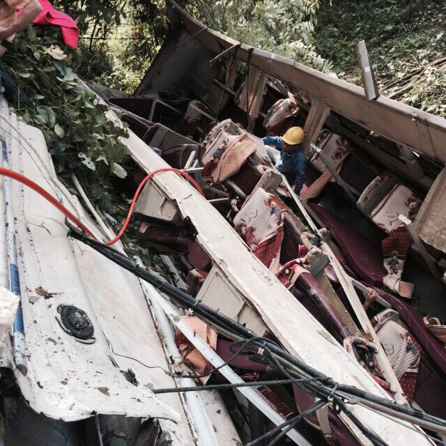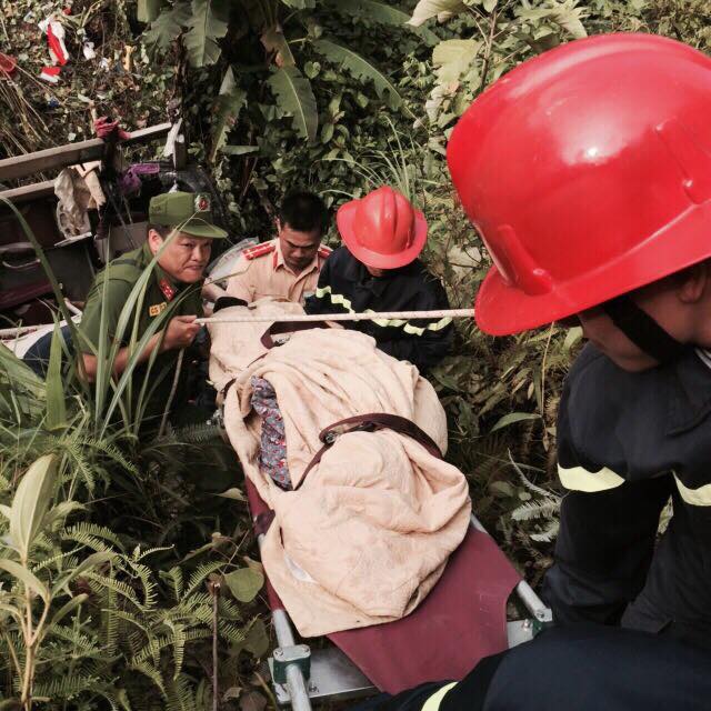 Rơi xuống vực sâu và nằm cách mặt đường 30m, chiếc xe khách giường nằm của nhà xe Duyệt Thuỷ vỡ toang, hư hỏng nặng
