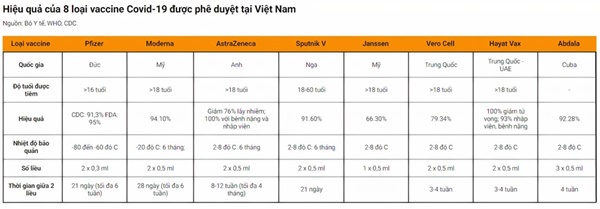 Tính đến ngày 19/9, Bộ Y tế đã phê duyệt có điều kiện 8 loại vaccine Covid-19, gồm AZD1222 (do AstraZeneca, Anh, sản xuất), Sputnik V (Viện Nghiên cứu Gamaleya, Nga, sản xuất), Vero Cell (Sinopharm, Trung Quốc, sản xuất) và Comirnaty (Pfizer và BioNTech, Đức, điều chế), Janssen (Johnson & Johnson sản xuất), Spikevax (Moderna, Mỹ, sản xuất), Hayat Vax (CNBG) và Abdala (Công ty AICA Laboraries, Base Business Unit (BBU) AICA - Cuba).