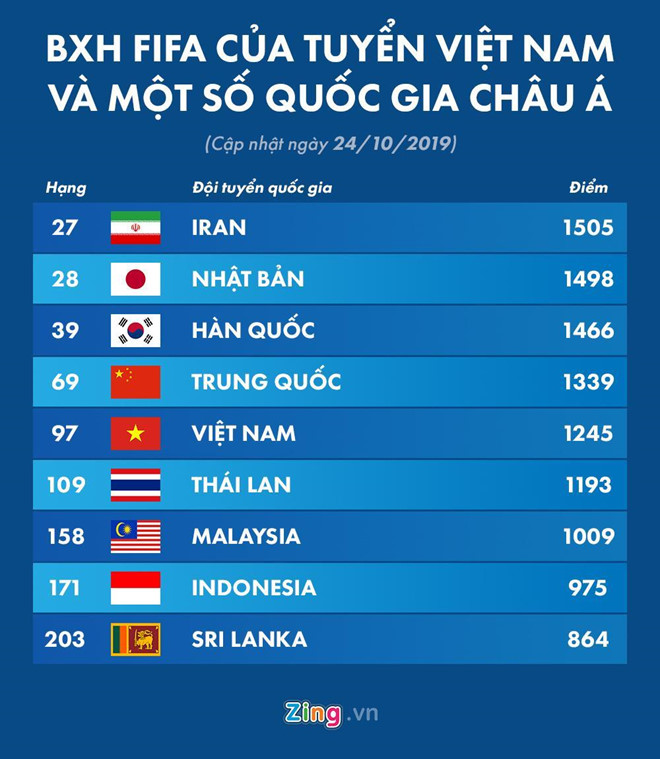 Trong bảng xếp hạng mới được FIFA công bố hôm 24/10, đội tuyển Việt Nam được cộng thêm 14 điểm từ hai chiến thắng trước Malaysia và Indonesia tại vòng loại World Cup. Kết quả này giúp thầy trò HLV Park Hang Seo có 1.245 điểm, tăng hai bậc để xếp hạng 97 FIFA cũng như trở lại top 15 châu Á.