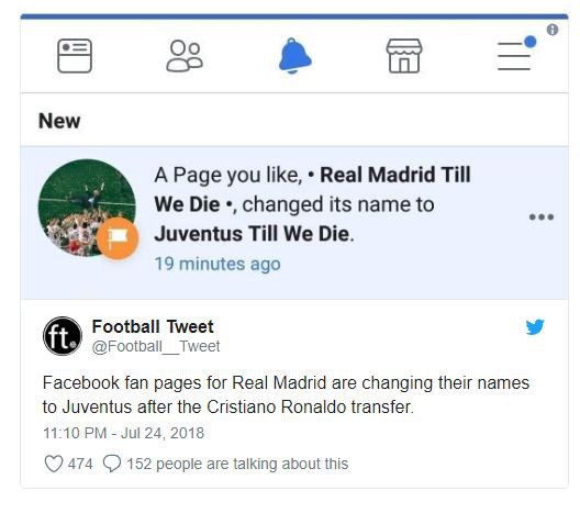"Real Madrid Till We Die" là fanpage có gần 350.000 người theo dõi nhưng mới đây trang cộng đồng fan Real Madrid này đã đổi tên thành "Juventus Till We Die", để cập nhật tình hình của Ronaldo và Juventus. 350.000 người đổi CLB yêu thích chỉ trong một nốt nhạc.