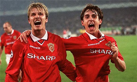 David Beckham và Gary Neville ăn mừng chiến thắng trong trận chung kết Champions League giữa Manchester United và Bayern Munich năm 1999. |