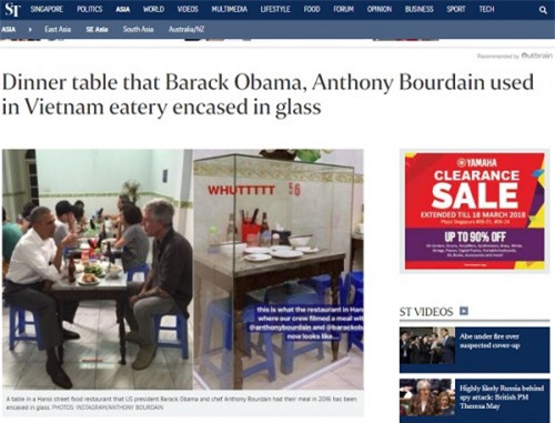 Tờ Straitstime cũng đăng tải thông tin trên với tiêu đề "Bàn ăn ông Barack Obama và Anthony Bourdain dùng trong nhà hàng Việt Nam được lồng kính". Bài viết cũng trích lại thông tin từ BBC và ý kiến của chủ quán bún chả Hương Liên. Bài viết cho biết, bát đĩa trên bàn ăn đã được rửa sạch, cũng như các vỏ chai bia.