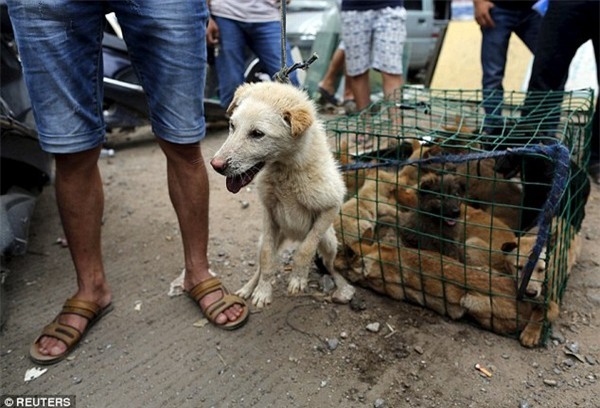 Bức ảnh chú chó con bị xích cổ đang cố gắng cào chân để thu hút sự chú ý của 1 người đàn ông trong lễ hội thịt chó lớn nhất Trung Quốc khiến bất cứ ai cũng cảm thấy thương cảm, xót xa.