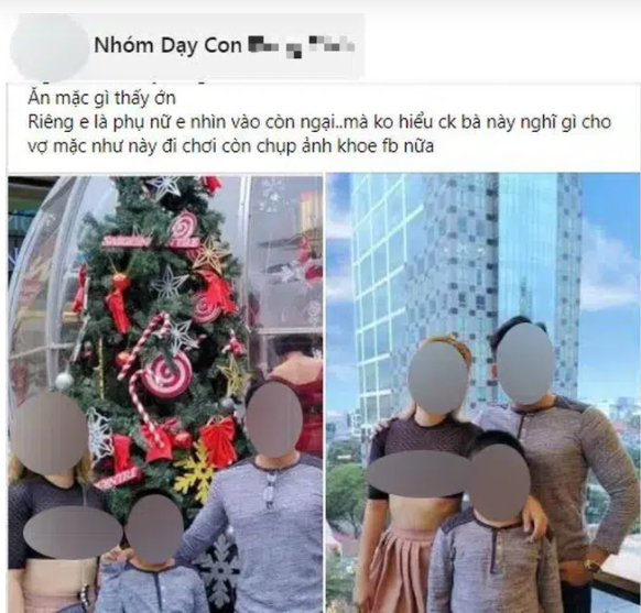 Trên các nhóm hội chia sẻ kinh nghiệm dạy con, nhiều cha mẹ chia sẻ ảnh của chị L.B.C kèm thắc mắc, cũng như lo lắng rằng phong cách ăn mặc phản cảm của bà mẹ này sẽ ảnh hưởng tới suy nghĩ, tâm lý của con trai.