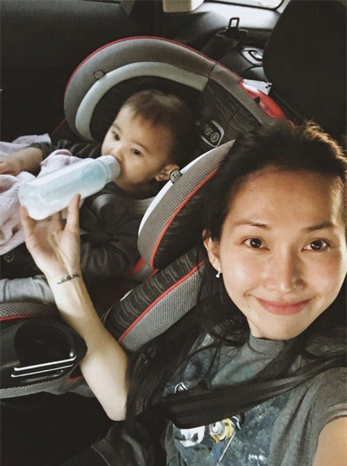 Kim Hiền cho con gái uống sữa trên đường đi du lịch. Nữ diễn viên chia sẻ: "Cả năm nuôi con, giờ mới được chồng cho đi nghỉ hè. Phải xõa thui! Las Vegas thẳng tiến!"