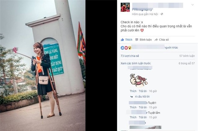 Fanpage dành cho những người yêu nghệ thuật vừa qua đăng tải hình ảnh cô gái nở nụ cười tươi đứng chụp hình selfie với đôi nạng gỗ. Bức ảnh nhanh chóng thu hút sự quan tâm trong cộng đồng mạng, với hơn 12.000 like (thích).