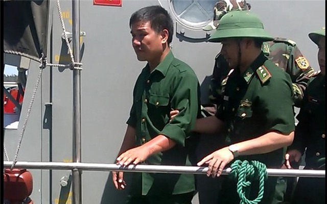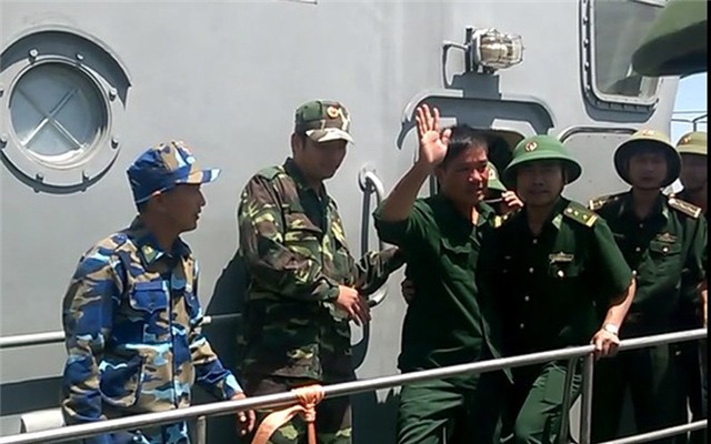 Bước lên từ tàu cứu hộ tại cầu cảng Hải đội 2, Thiếu tá Nguyễn Hữu Cường vẫy tay chào các cán bộ, chiến sỹ và người dân đang nóng lòng chờ đón. |