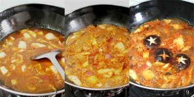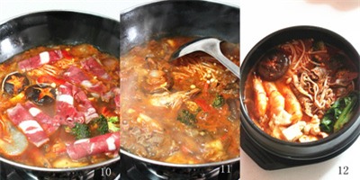 ![]() | ![]() Thêm nước vào. Tiếp đến nêm nếm cùng với ớt gochujang, nước tương, muối, hạt nêm và hạt tiêu. Khi hỗn hợp sôi thì cho nấm hương vào. |