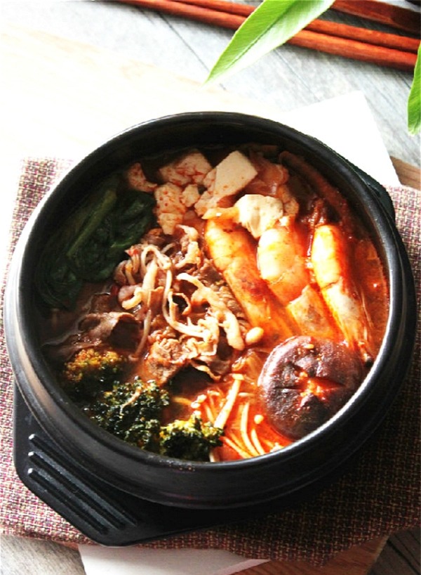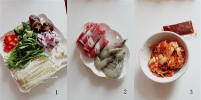 120g ba chỉ bò 70g nấm kim châm 5 con tôm 3 cây nấm hương 1 miếng đậu phụ 50g súp lơ xanh Ớt đỏ, hành tây, hành lá 40g ớt gochujang 4 lát gừng ½ muỗng cafe nước tương ¼ muỗng cafe hạt tiêu 1 muỗng cafe hạt nêm 1 muỗng cafe muối |