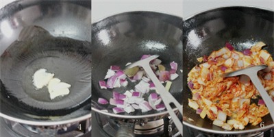 ![]() | ![]() Bắc chảo lên bếp cùng chút dầu ăn, cho gừng vào phi thơm sau đó cho hành tây thái nhỏ vào xào đều. Khi hành tây hơi mềm thì cho kim chi vào xào. |