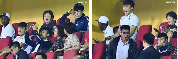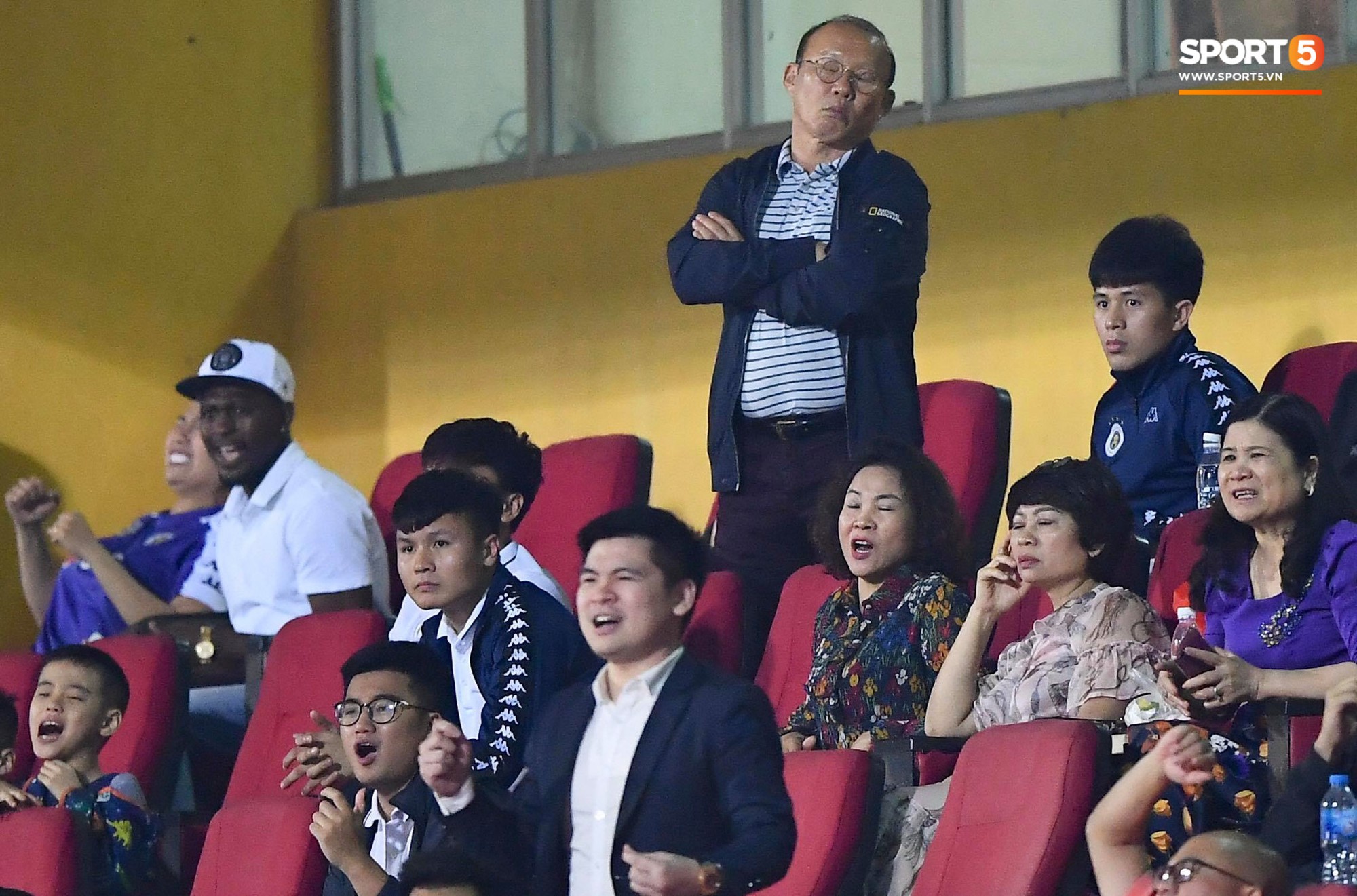 Chỉ sau đó 1 phút, Hà Nội FC có thêm một cơ hội ngon ăn nhưng cú đánh đầu ở tư thế trống trải của Ngân Văn Đại lại đi ra ngoài trong gang tấc. Từ HLV Park Hang Seo đến bà xã Choi Sang-a và các cầu thủ như Bùi Tiến Dũng, Quang Hải, Đình Trọng đều không tin nổi pha bóng đó. Ảnh: Tiến Tuấn.