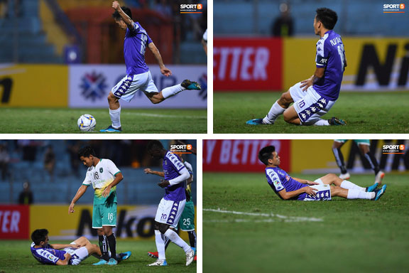 Bước sang hiệp 2, Hà Nội FC có cơ hội ngon ăn khi được hưởng phạt đền nhưng đội trưởng Nguyễn Văn Quyết lại sút ra ngoài sau pha trượt chân. Ngay sau đó, anh phải rời sân vì bị căng cơ đùi phải. Ảnh: Tiến Tuấn.
