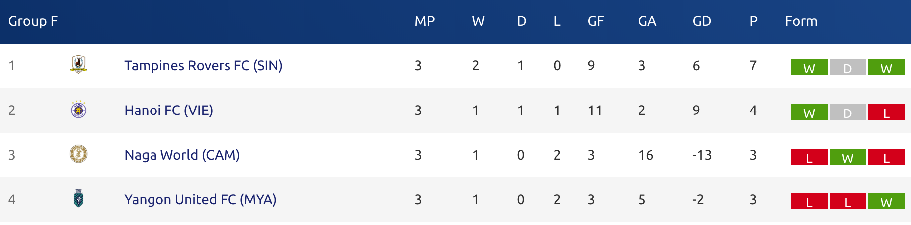 Thua trận đầu tiên, Hà Nội FC tụt xuống vị trí thứ 2 bảng F với 4 điểm. Tampines Rovers (Singapore) vươn lên dẫn đầu sau chiến thắng 5-1 trước Naga World. Ảnh: Chụp màn hình.