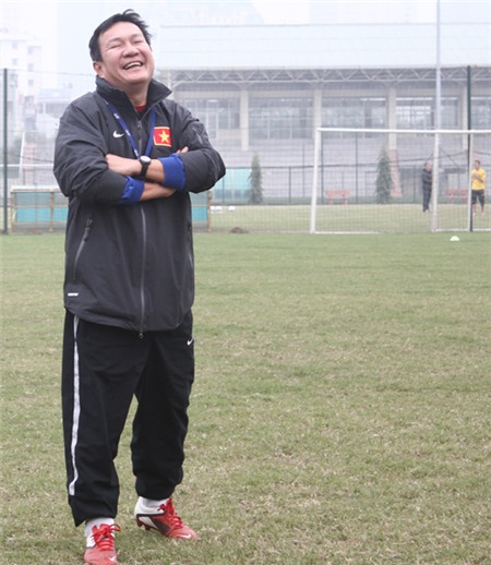 Trên sân HLV Hoàng Văn Phúc luôn cười rất tươi. |
