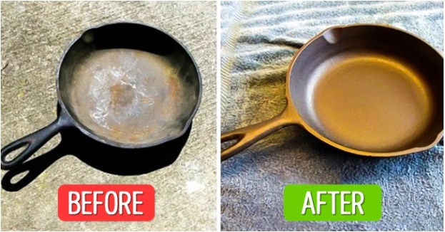 Nếu ở nhà có chảo gang lâu ngày không dùng đến, bị rỉ sét trông rất bẩn và bạn muốn chúng trở lại sáng bóng như cũ thì đừng quên làm theo thủ thuật này.Đầu tiên, đổ nước rửa chén lên vết bẩn, sau đó cho chảo vào túi ni lông buộc lại khoảng 1-2 ngày rồi mới cọ rửa lại cho sạch. Lặp lại các thao tác trên thêm 1 lần nữa, để 1 ngày rồi rửa sạch vết bẩn bằng nước nóng.