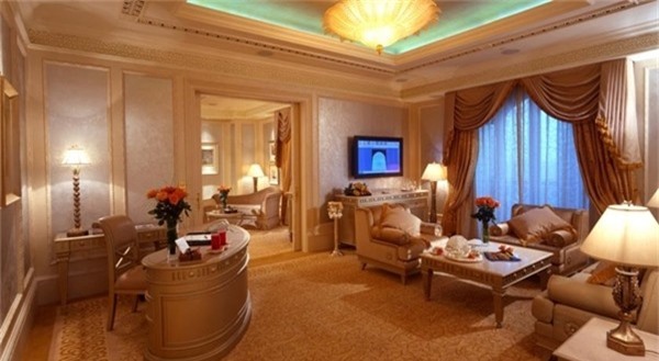 Khách sạn siêu xa xỉ Emirate Palace được xây dựng bởi hoàng gia Al Nahyan vào năm 2 có giá phòng dao động từ 470 đến 15.000 USD 005 (khoảng hơn 300 triệu đồng) mỗi đêm. Nơi đây thường xuyên đón tiếp những nguyên thủ quốc gia, các nhà ngoại giao, những người thuộc tầng lớp quý tộc, các ông trùm kinh doanh, các ngôi sao của làng giải trí trên thế giới.