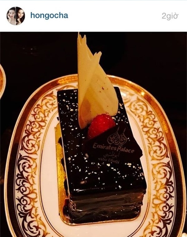 Đáng chú ý, Hồ Ngọc Hà còn chia sẻ hình ảnh một chiếc bánh dát lá vàng có giá khoảng 800 đô la (khoảng 16 triệu đồng) trong một bữa ăn tráng miệng tại khách sạn Emirates Palace.