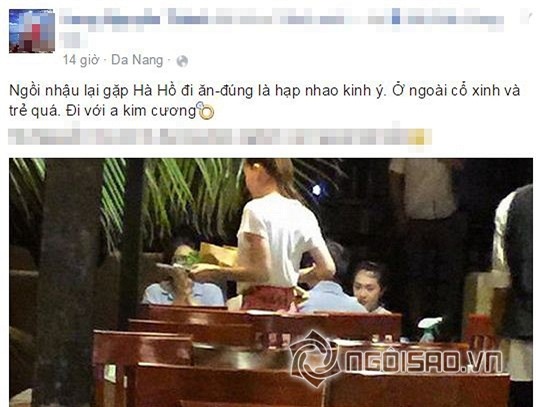 Mới đây, một tài khoản facebook đã cho biết vô tình gặp Hà Hồ đi ăn với đại gia kim cương. Người này viết: "Ngồi nhậu lại gặp Hà Hồ đi ăn, đúng là hợp nhau kinh ý. Ở ngoài cô xinh và trẻ quá đi. Đi với anh kim cương".