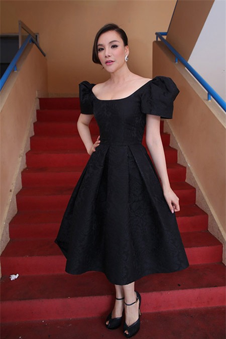 Trong khi Hà Hồ mặc váy trắng, Hồ Quỳnh Hương lại chọn váy đen hở vai, cũng của Công Trí. |