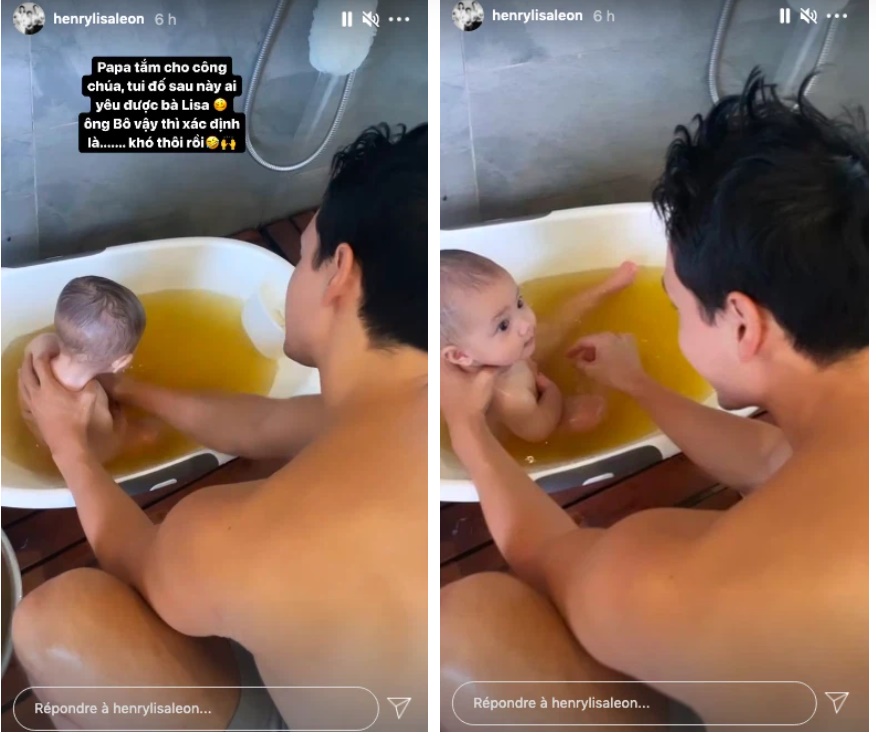 Bà mẹ 3 con chia sẻ hình ảnh sáng sớm ông bố tận tuỵ tắm cho cô con gái kèm lời kết luận: "Papa tắm cho công chúa, tôi đố ai sau này yêu được bà Lisa, ông Bô vậy là xác định rồi, khó thôi rồi". Trong ảnh, Kim Lý vô cùng cẩn thận tắm táp cho cô con cái nhỏ, cũng không quên trêu đùa cùng con gái.