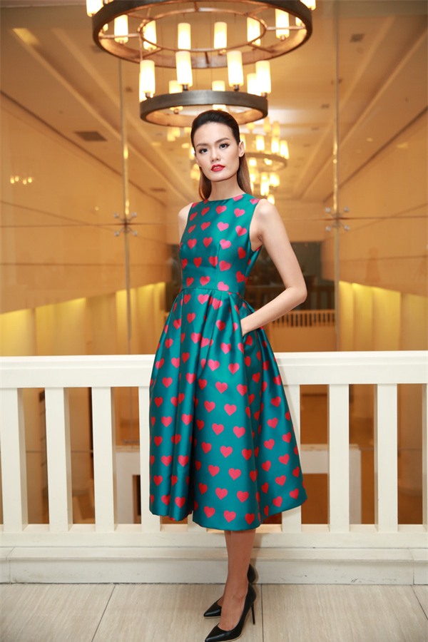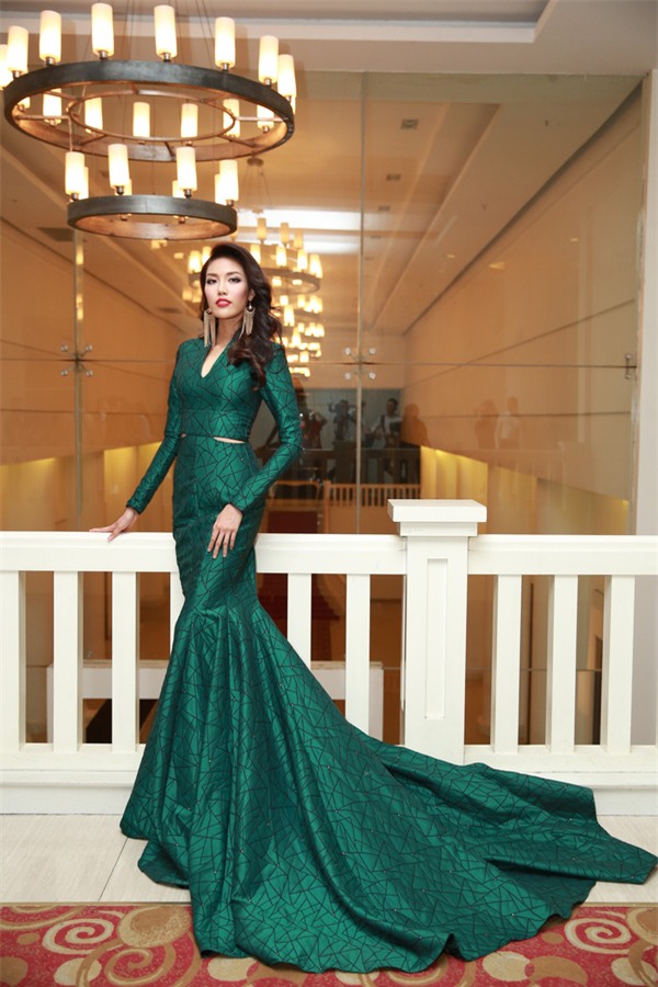 Lan Khuê quý phái với đầm dạ hội gam xanh lá