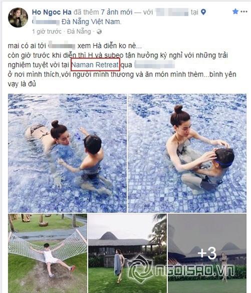 Thời gian gần đây, Hồ Ngọc Hà và Kim Lý thường xuyên bắt gặp đi du lịch cùng nhau. Thậm chí, Kim Lý còn đưa Hà Hồ về ra mắt mẹ. Mới đây, Hồ Ngọc Hà đăng tải hình ảnh ở Đà Nẵng cùng con: ".. Trước khi diễn thì Hà và Subeo tận hưởng kỳ nghỉ với những trải nghiệm tuyệt vời ở nơi mình thích, với người mình thương và ăn món mình thèm...bình yên vậy là đủ".