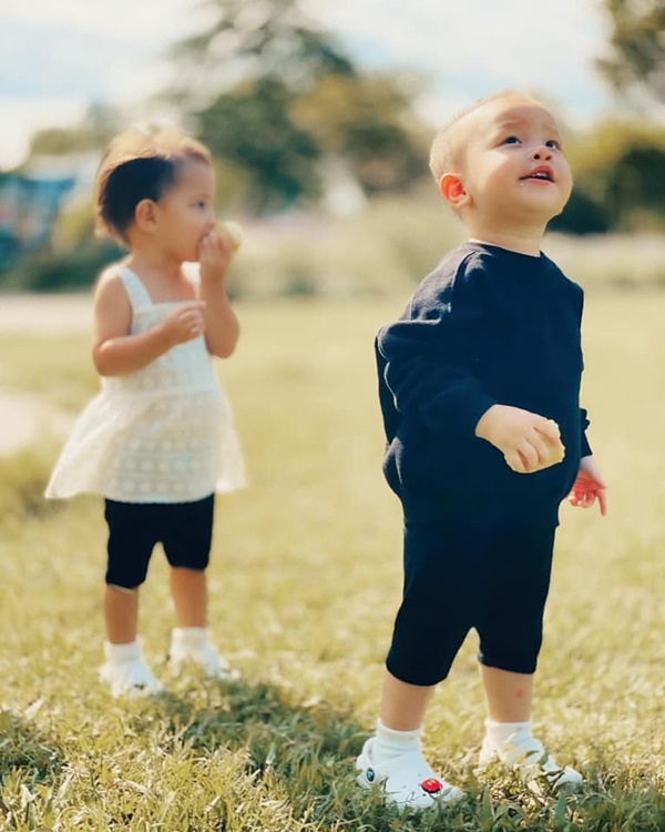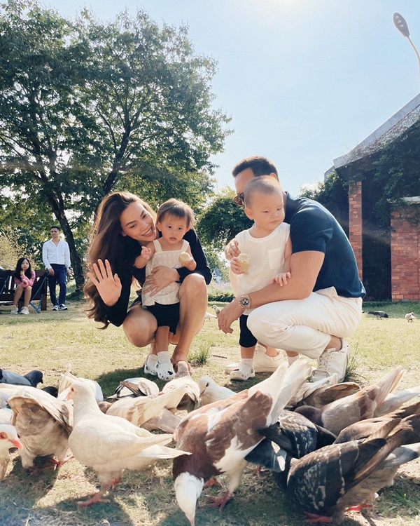 Trong hình, "bộ tứ" nhà Hà Hồ mặc quần áo thoải mái nhưng vẫn sang trọng với tone màu chủ đạo trắng - đen - xanh. Hai nhóc tỳ Lisa và Leon vô cùng hào hứng và cười toe toét khi được bố mẹ đưa ra ngoài chơi, dường như cặp song sinh rất thích thú với những con vật và cây cối ở đây.
