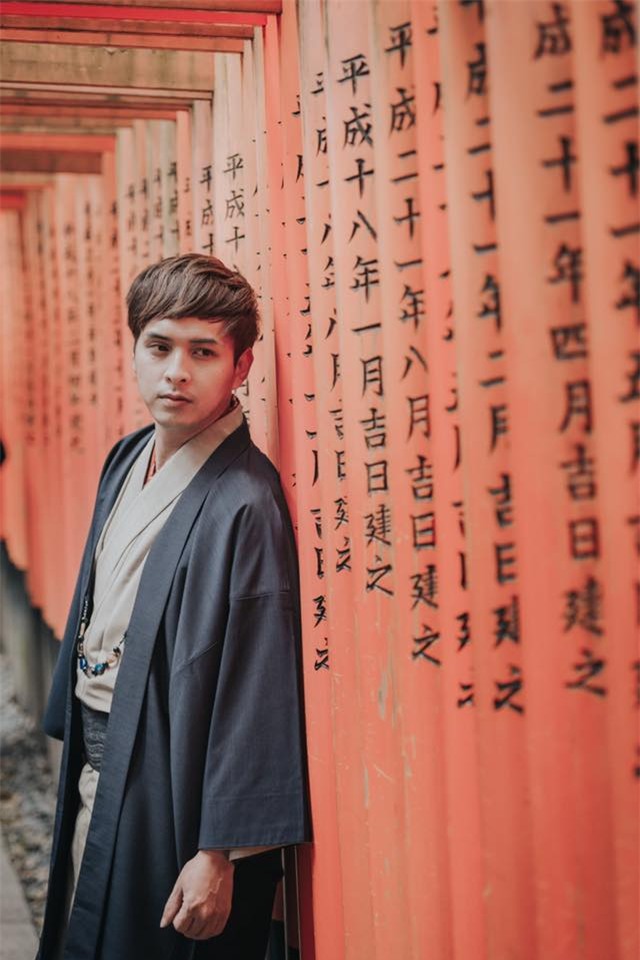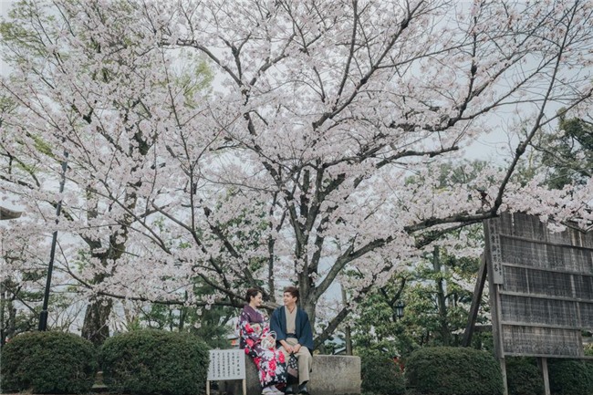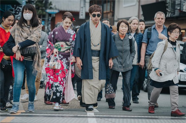 Hồ Quang Hiếu và Bảo Anh diện kimono sánh đôi trên đường phố Nhật Bản.
