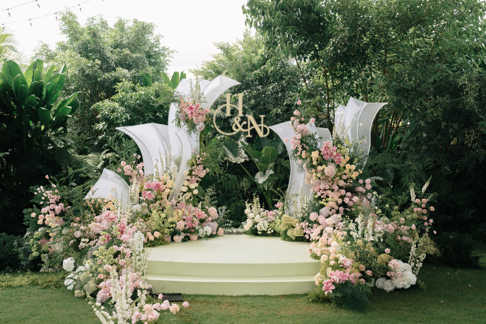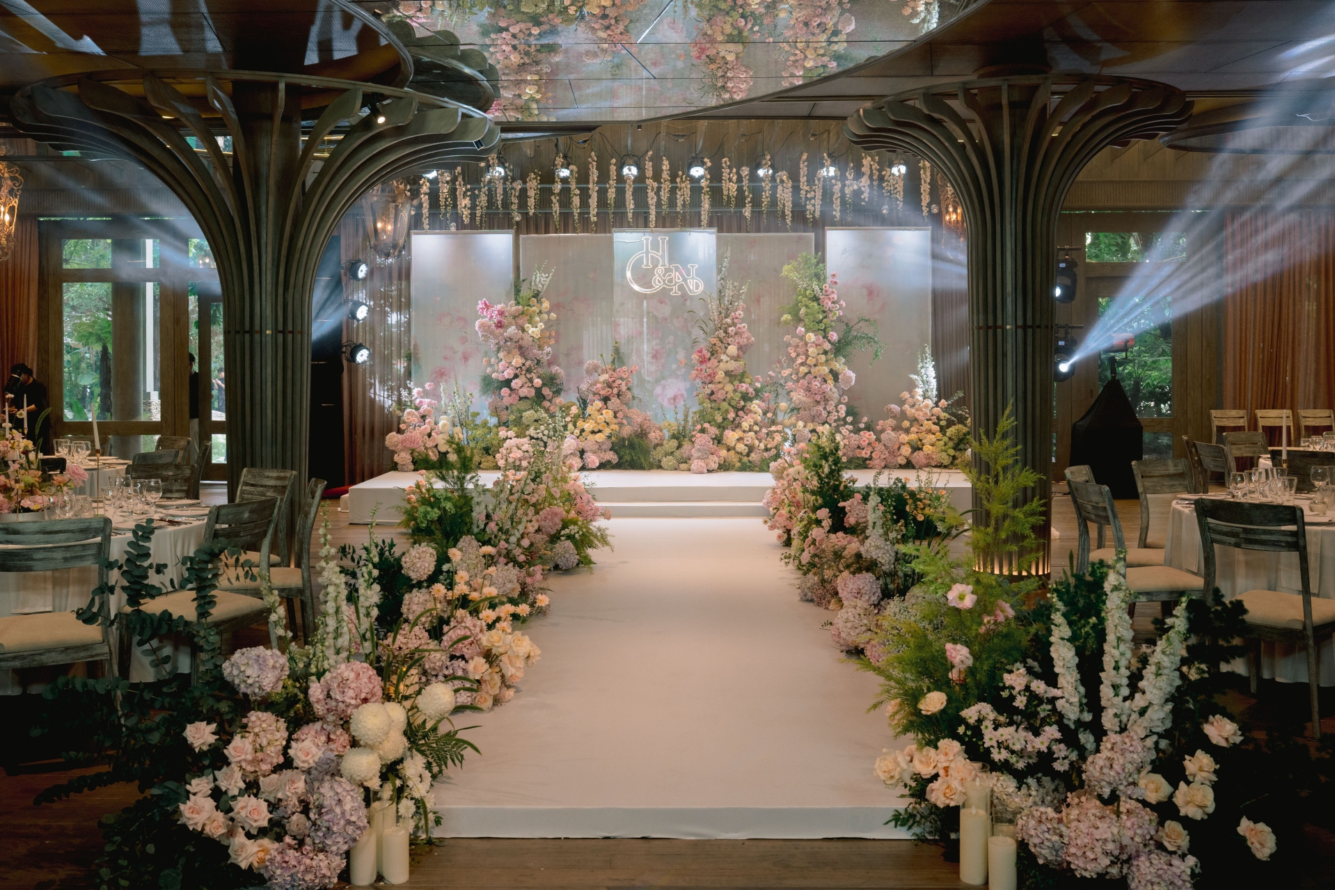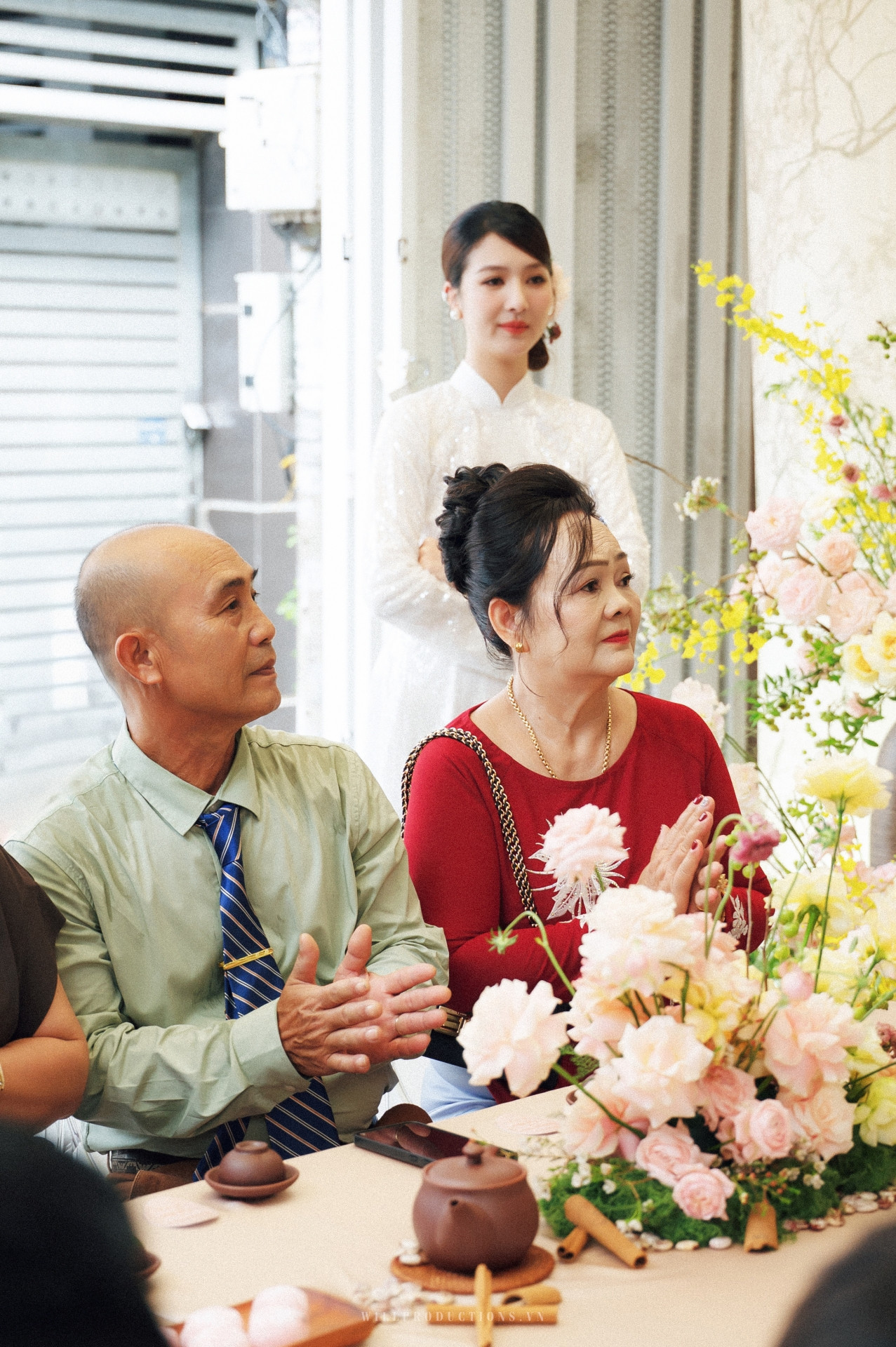 Nghi thức truyền thống được thực hiện trang trọng, không gian trang trí tinh tế với hoa tươi phủ khắp, tông trắng chủ đạo.