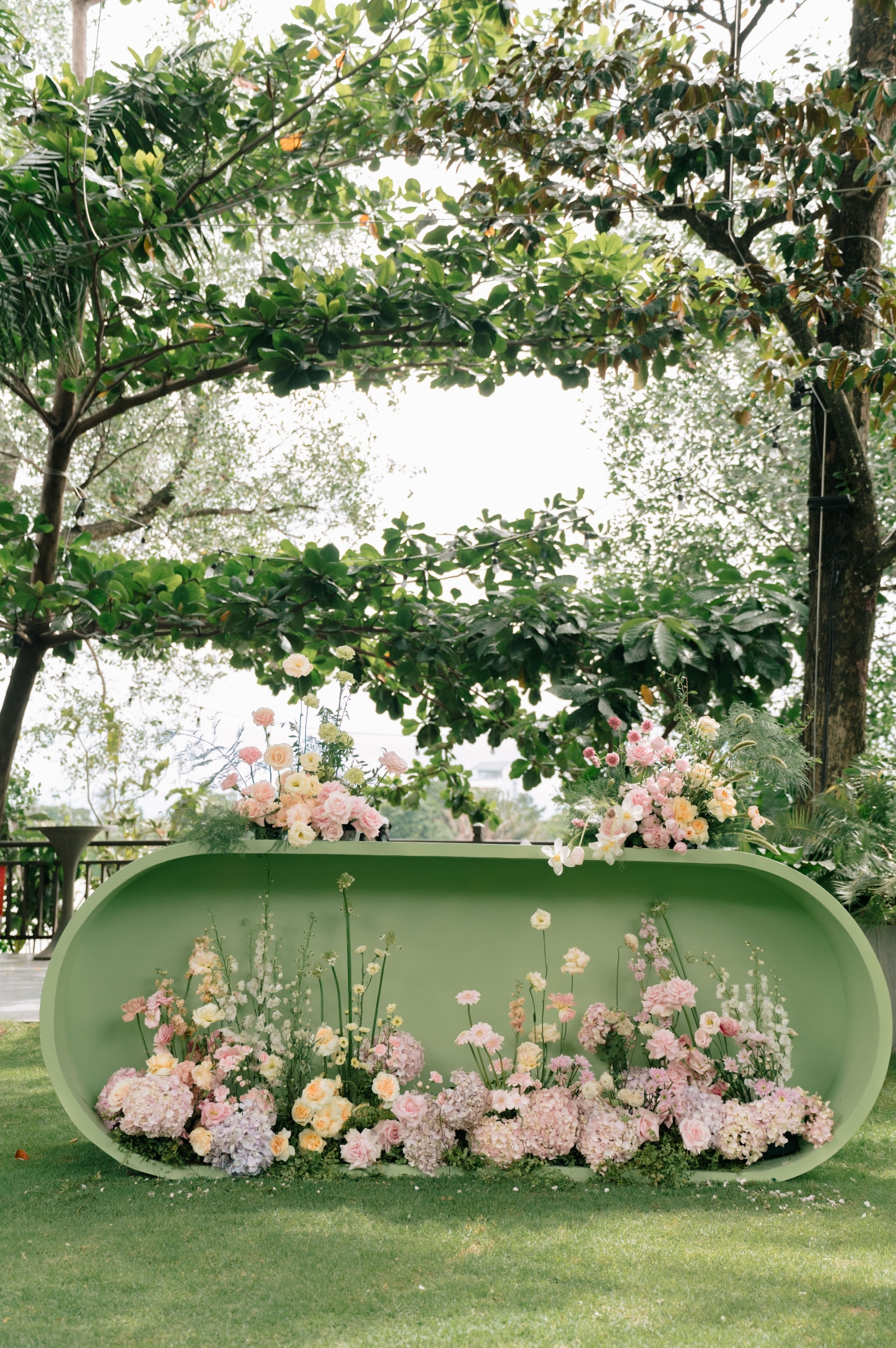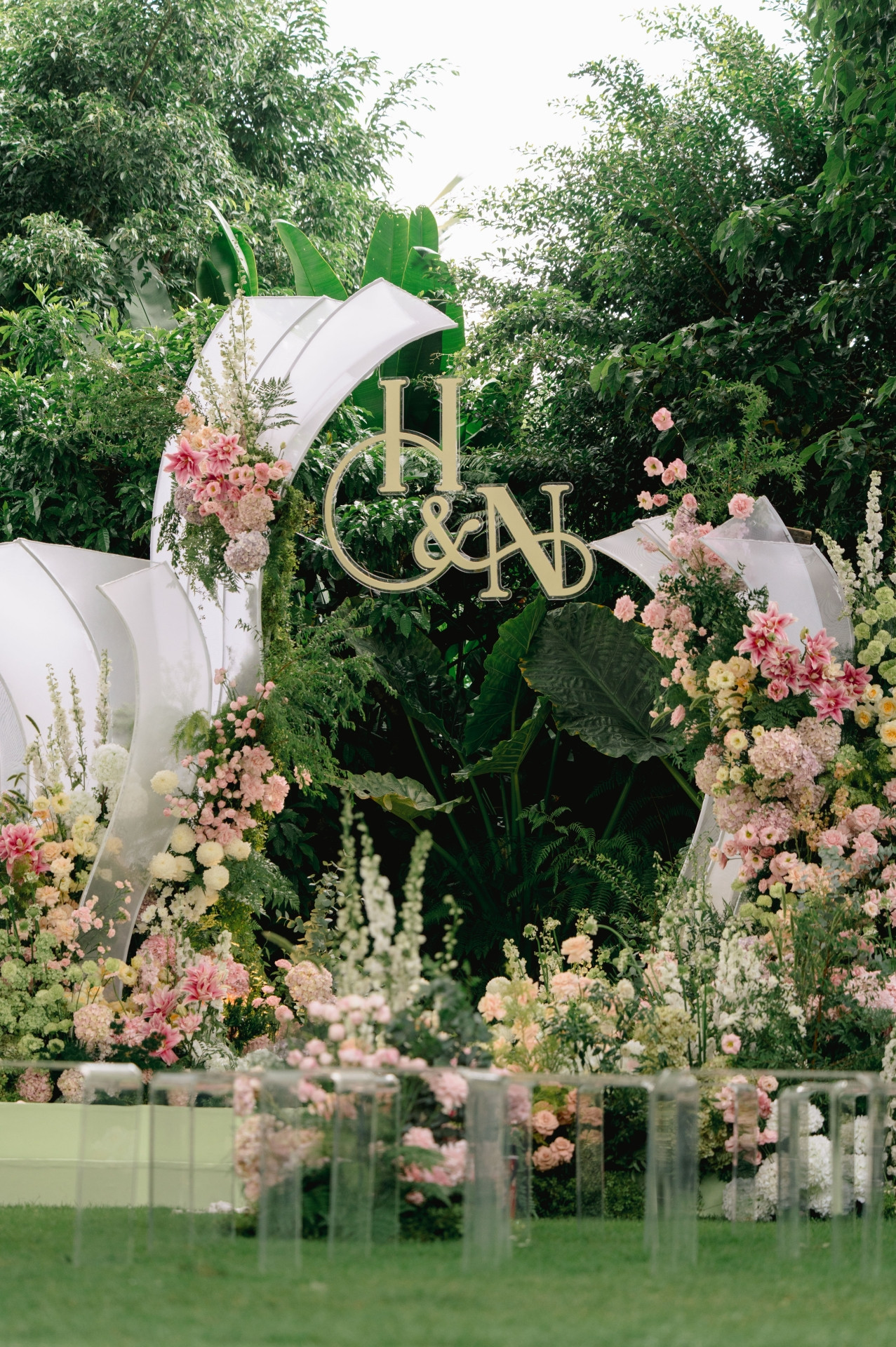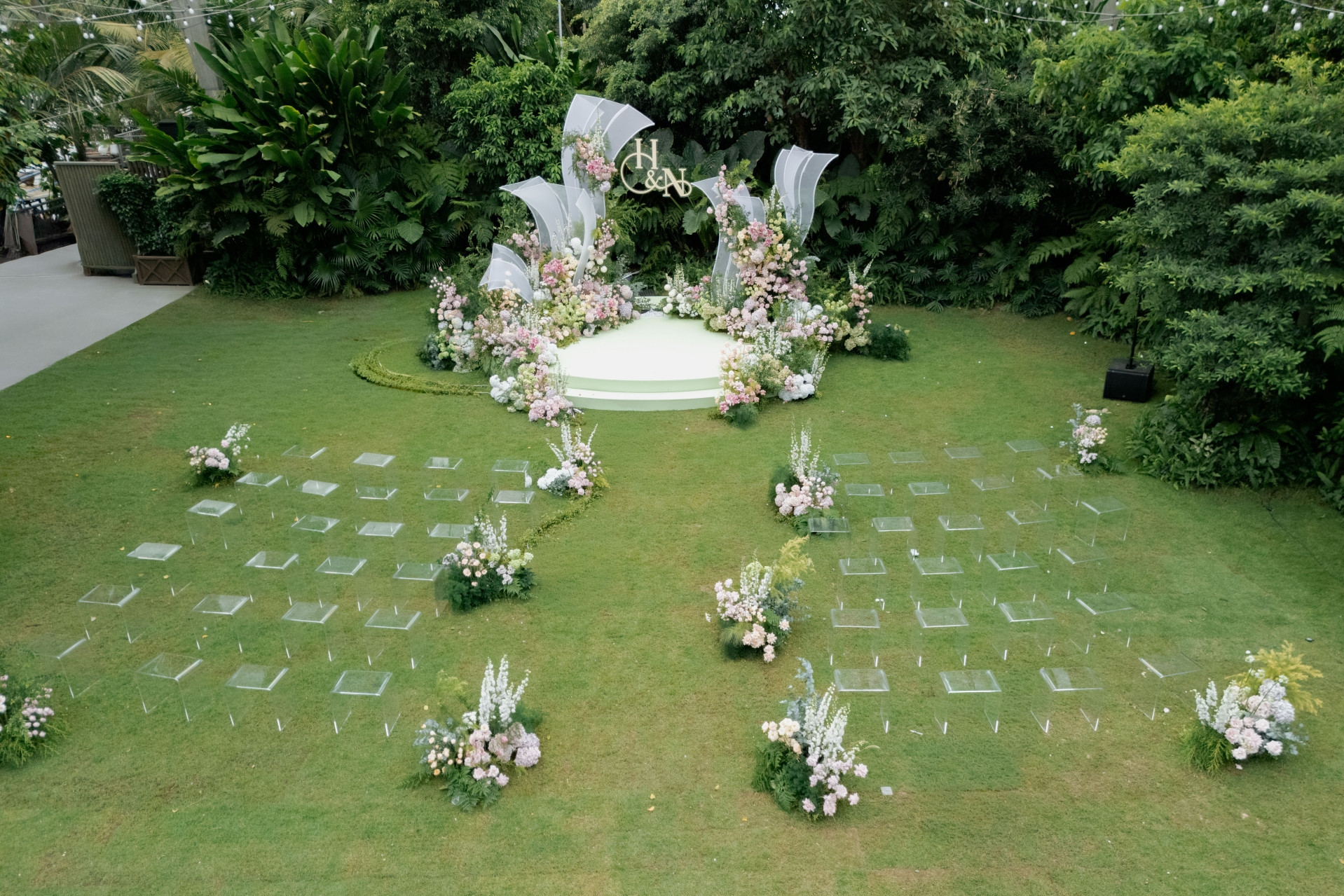 Nghi thức truyền thống được thực hiện trang trọng, không gian trang trí tinh tế với hoa tươi phủ khắp, tông trắng chủ đạo.