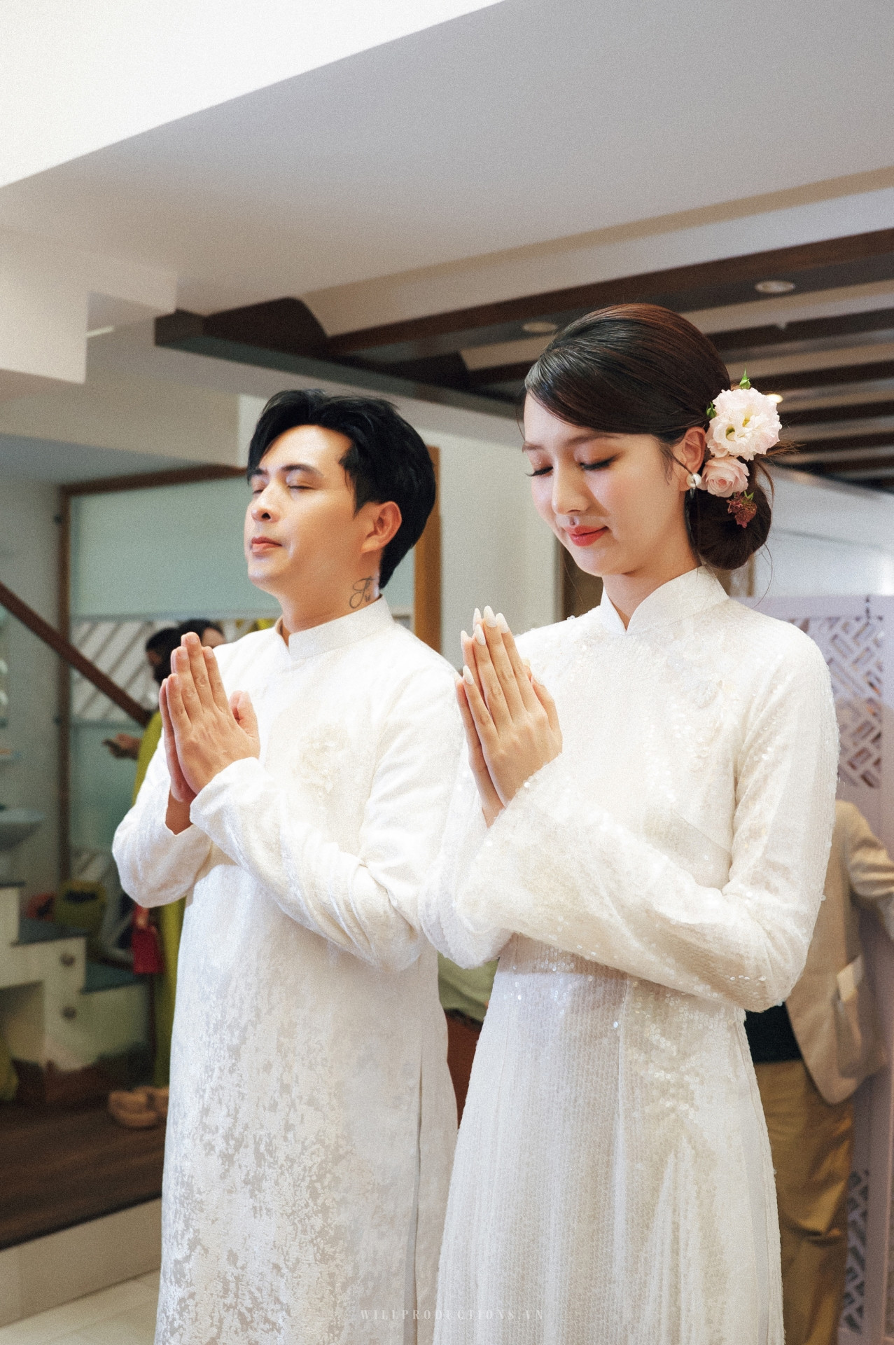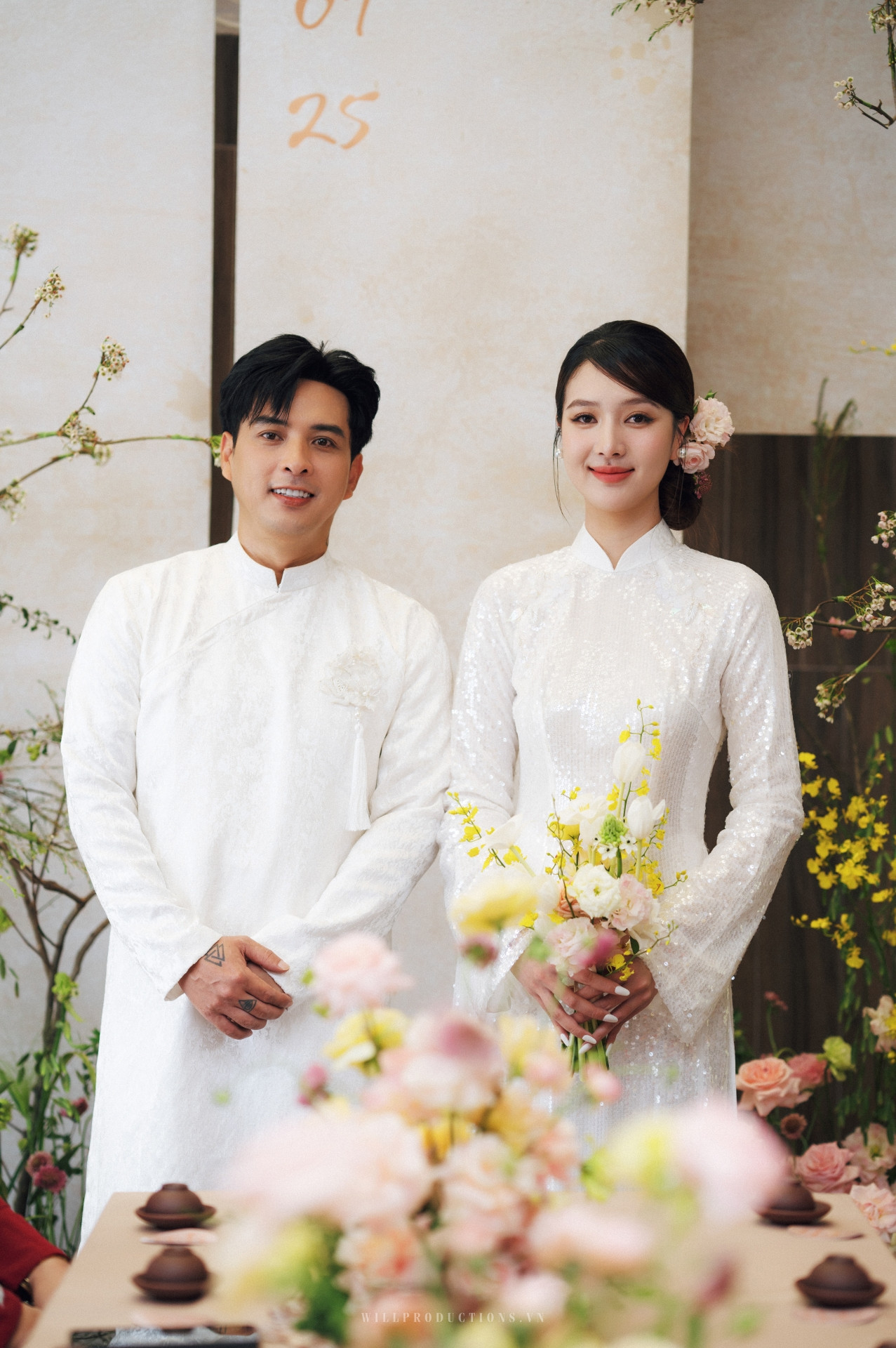 Cô dâu - chú rể xuất hiện trong áo dài trắng, sánh đôi rạng rỡ, thu hút mọi ánh nhìn. Không gian lễ cưới vừa giản dị vừa sang trọng, gợi cảm giác gần gũi nhưng vẫn đậm chất nghệ sĩ.