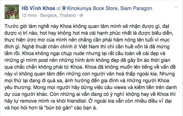 Tối ngày 15/4, Hồ Vĩnh Khoa đăng dòng trạng thái dài trên trang cá nhân chia sẻ cảm xúc của mình. Anh mở đầu: "Trước giờ làm nghề này Khoa không quan tâm mình sẽ nhận được gì, đạt được vị trí nào, hot hay không hot mà cái hạnh phúc nhất là được biểu diễn, thực hiện ước mơ của mình nên chẳng cần phải hâm nóng tên tuổi vì mục đích gì. Nghệ thuật chân chính ở Việt Nam thì chỉ cần huề vốn là đã mừng lắm rồi. Khoa không ngại chụp nude nhưng lại rất cầu toàn về cái đẹp và những gì mình post nên những hình ảnh không đẹp đẽ gây ồn ào thời gian qua chắc chắn không phải từ Khoa".