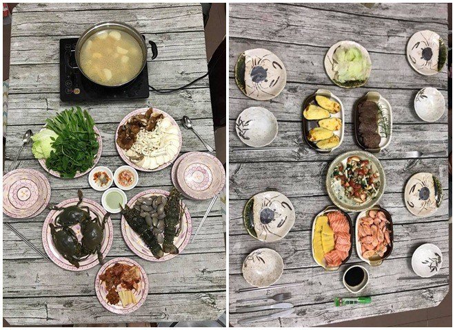 Tùy từng bữa ăn chị mất khoảng thời gian nấu nướng khác nhau, có bữa đơn giản chỉ mất khoảng nửa tiếng còn có bữa cầu kỳ phải mất cả ngày. Trung bình, mỗi bữa ăn bình thường của gia đình chị hết khoảng 200 - 300 nghìn còn những bữa ăn “bày vẽ” sơn hào hải vị hoặc ăn đồ Tây lên tới khoảng 500 nghìn - 1 triệu.
