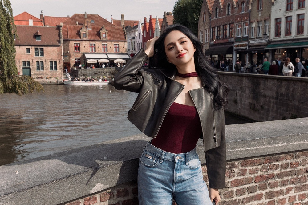 Trong hình, hoa hậu khoe trình phối đồ đẳng cấp với áo thun, quần jeans khoác ngoài áo da cá tính, năng động. Hương Giang nâng tầm diện mạo bằng chiếc túi hiệu sang chảnh từ nhà mốt Goyard Boheme Boho.