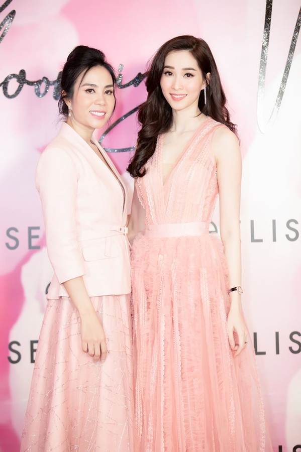 Hoa hậu thân thiện Dương Thuỳ Linh cũng chọn sắc hồng pastel, phối với áo yếm màu kem thanh lịch.