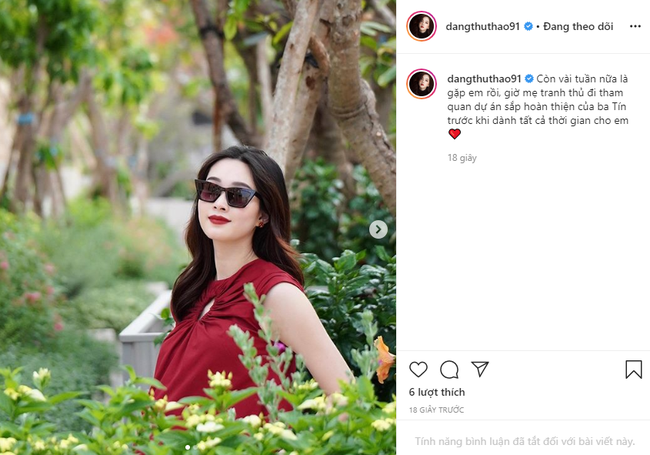 Mới đây, trên tài khoản Instagram, Hoa hậu Đặng Thu Thảo đã chính thức công khai việc đang mang thai và chuẩn bị đón em bé chào đời: "Còn vài tuần nữa là gặp em rồi, giờ mẹ tranh thủ đi tham quan dự án sắp hoàn thiện của ba Tín trước khi dành tất cả thời gian cho em".