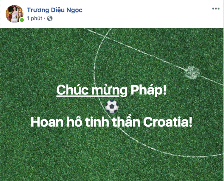 Sau hơn 1 tháng diễn ra, giải đấu lớn nhất thế giới World Cup 2018 đã đi đến trận cuối cùng. Sau 2 hiệp đấu căng thẳng, chiến thắng đã thuộc về đội tuyển Pháp với kết quả 4 -2. Hoà cùng không khí trên toàn thế giới, các nghệ sĩ Vbiz cùng liên tục cập nhật cảm xúc của mình trên trang cá nhân. Sau chiến thắng của Pháp, nhiều nghệ sĩ như Đặng Thu Thảo, Diệu Ngọc, Trà Ngọc Hằng,... vui mừng nhưng cũng bày tỏ sự thán phục trước tinh thần thi đấu quyết tâm đến cùng của Croatia.