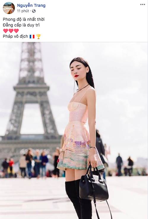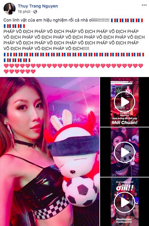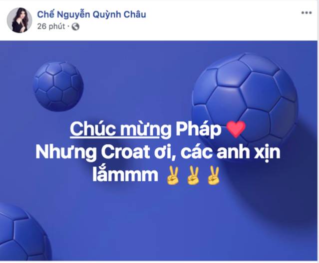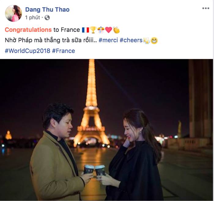 Hoa hậu Đặng Thu Thảo chúc mừng đến đội tuyển Pháp. Nhờ Pháp mà người đẹp thắng trà sữa từ ông xã.