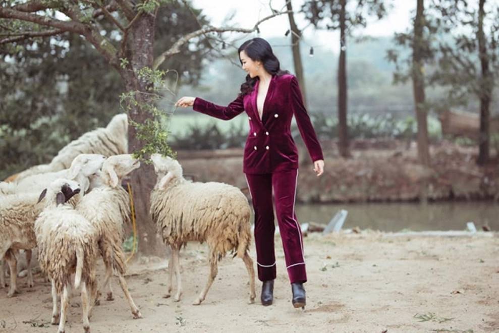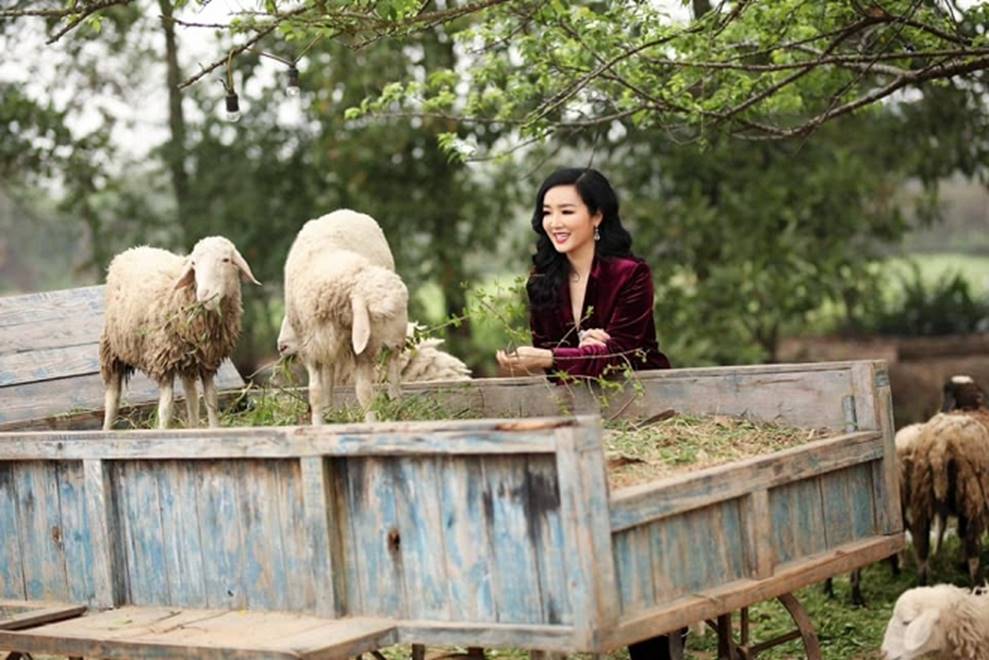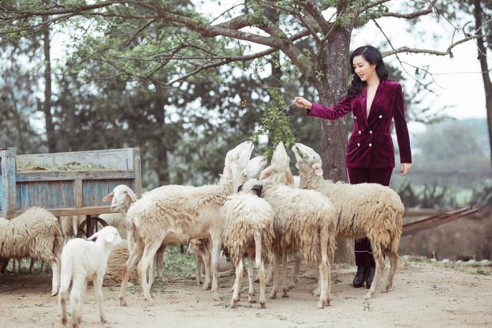 Hoa hậu Đền Hùng Giáng My vui đùa cùng đàn cừu.
