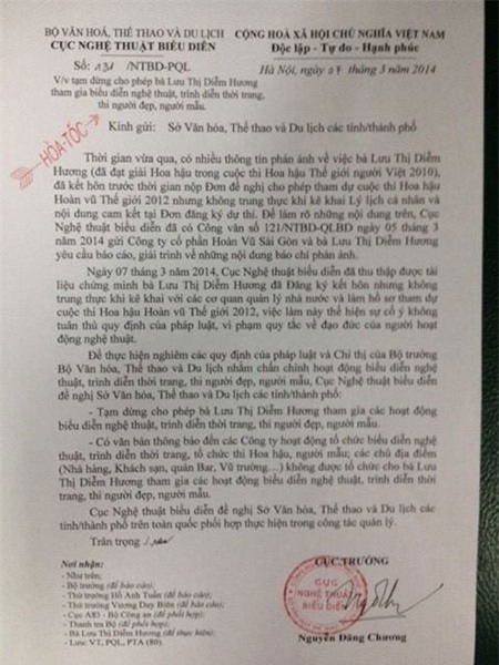 Hôm 6/3, ông Nguyễn Đăng Chương - Cục trưởng Cục Nghệ thuật biểu diễn - cho biết, sau khi Hoa hậu thế giới người Việt 2010 Lưu Thị Diễm Hương giải trình, Cục sẽ cân nhắc về hình thức xử lý. Đến ngày 7/3, Cục NTBD đã có công văn hỏa tốc, số 131/NTBD-PQL gửi tới Sở VH-TT-DL của các tỉnh và thành phố.