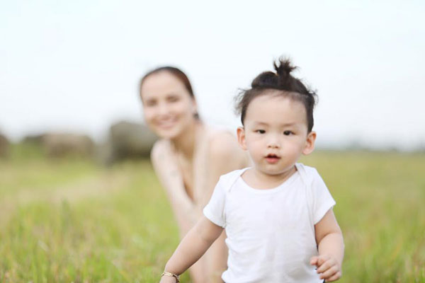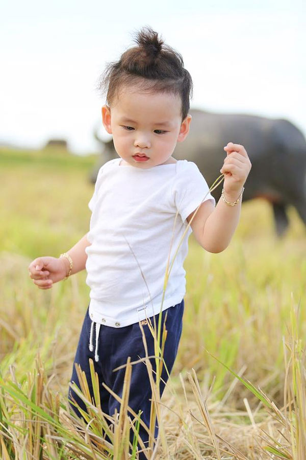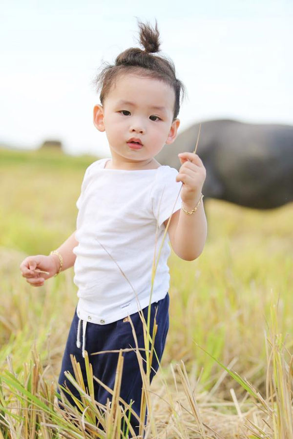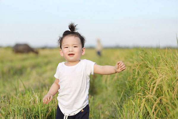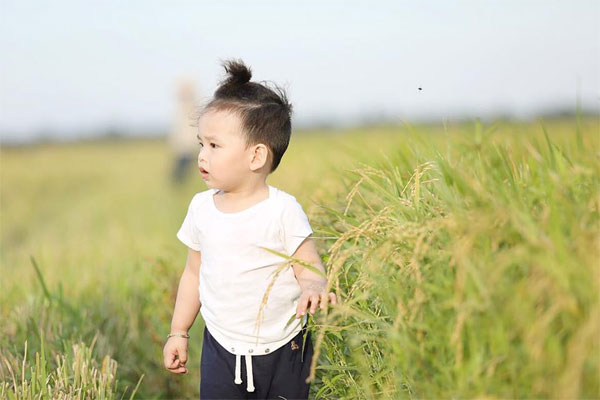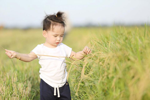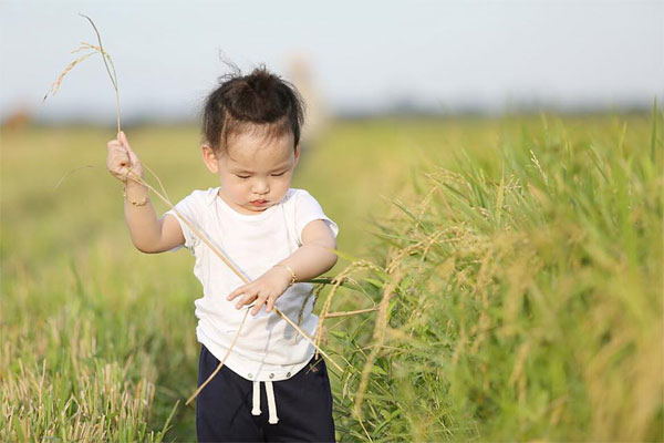 Hai mẹ con Hoa hậu Diễm Hương đốn tim fan hâm mộ khi chơi đùa trên cánh đồng lúa chín.