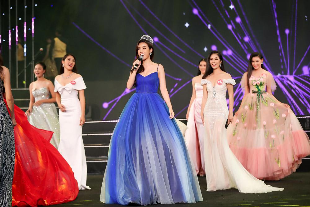 Đương kim Hoa hậu Việt Nam 2018, Đỗ Mỹ Linh cất cao tiếng hát cùng với 44 thí sinh. Cô xuất hiện như một nàng tiên nữ với chiếc váy xoè đẹp mắt.