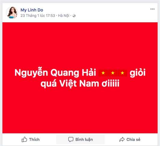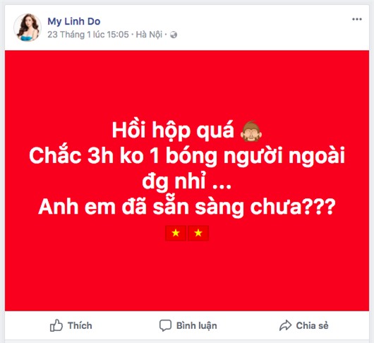 Một trong những cổ động viên trong showbiz được quan tâm nhiều nhất đó chính là Hoa hậu Đỗ Mỹ Linh khi trước đó, người đẹp gây xôn xao khi xuất hiện những comment cùng với thủ môn Bùi Tiến Dũng trên trang cá nhân. Hoa hậu Việt Nam 2016 cũng tiết lộ sẽ có mặt ở Trung Quốc để dõi theo trận chung kết của đội tuyển U23 Việt Nam. Tuy nhiên, trong suốt ngày hôm nay, Đỗ Mỹ Linh hoàn toàn không đăng tải bất cứ status này, khác với không khí nồng nhiệt ở trận bán kết, tứ kết vừa qua. Cũng không ai biết, người đẹp liệu có đang có mặt ở Trung Quốc giữa thời điểm này không?.