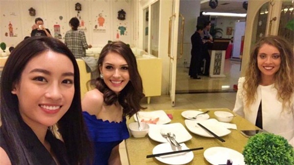 Đại diện Colombia là người đẹp mà Mỹ Linh gặp đầu tiên tại Trung Quốc. Cả hai đã nhanh chóng chào hỏi và vui vẻ chụp ảnh cùng nhau.